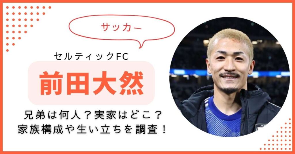 スコットランドのセルティックで活躍中のサッカー選手・前田大然さん。 「前田大然の兄弟は何人いるの?」「両親はどんな人?」と気になっている方も多いですよね。 この記事では「前田大然 兄弟」をテーマに、家族構成や両親、実家、そして生い立ちまでわ... -